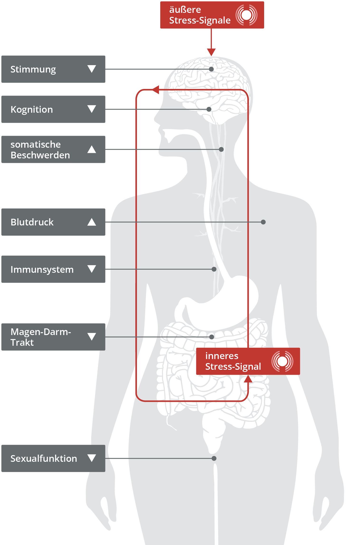 Abbildung: Auswirkungen von Stress auf Körper und Psyche Stress ist die ureigene Reaktion des Körpers auf gefährliche Situationen. Die Kampf- oder Fluchtreaktion ist evolutionsbiologisch sogar zunächst positiv: Bei Gefahr mobilisiert der Körper alle seine Energiereserven und lenkt seine gesamte Aufmerksamkeit auf diese eine Situation. Dabei ist es ganz egal, ob es sich um eine körperliche oder psychische Belastung handelt.