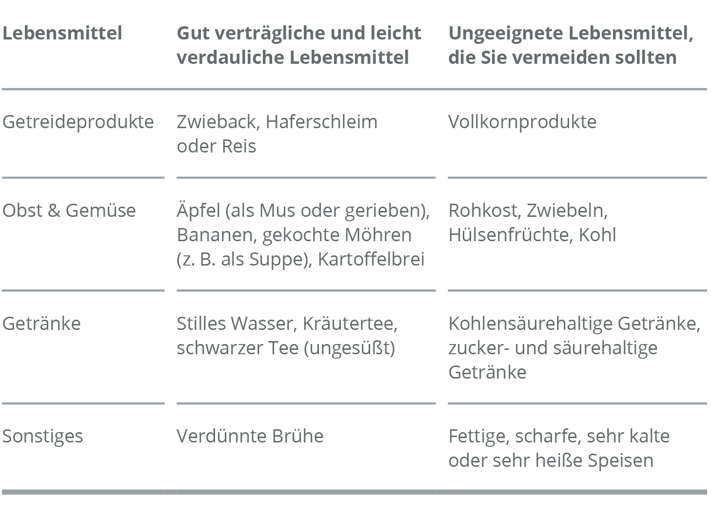Starke Flüssigkeits- und Elektrolytverluste können mit speziellen Elektrolytmischungen ausgeglichen werden, die in der Apotheke gekauft werden können.