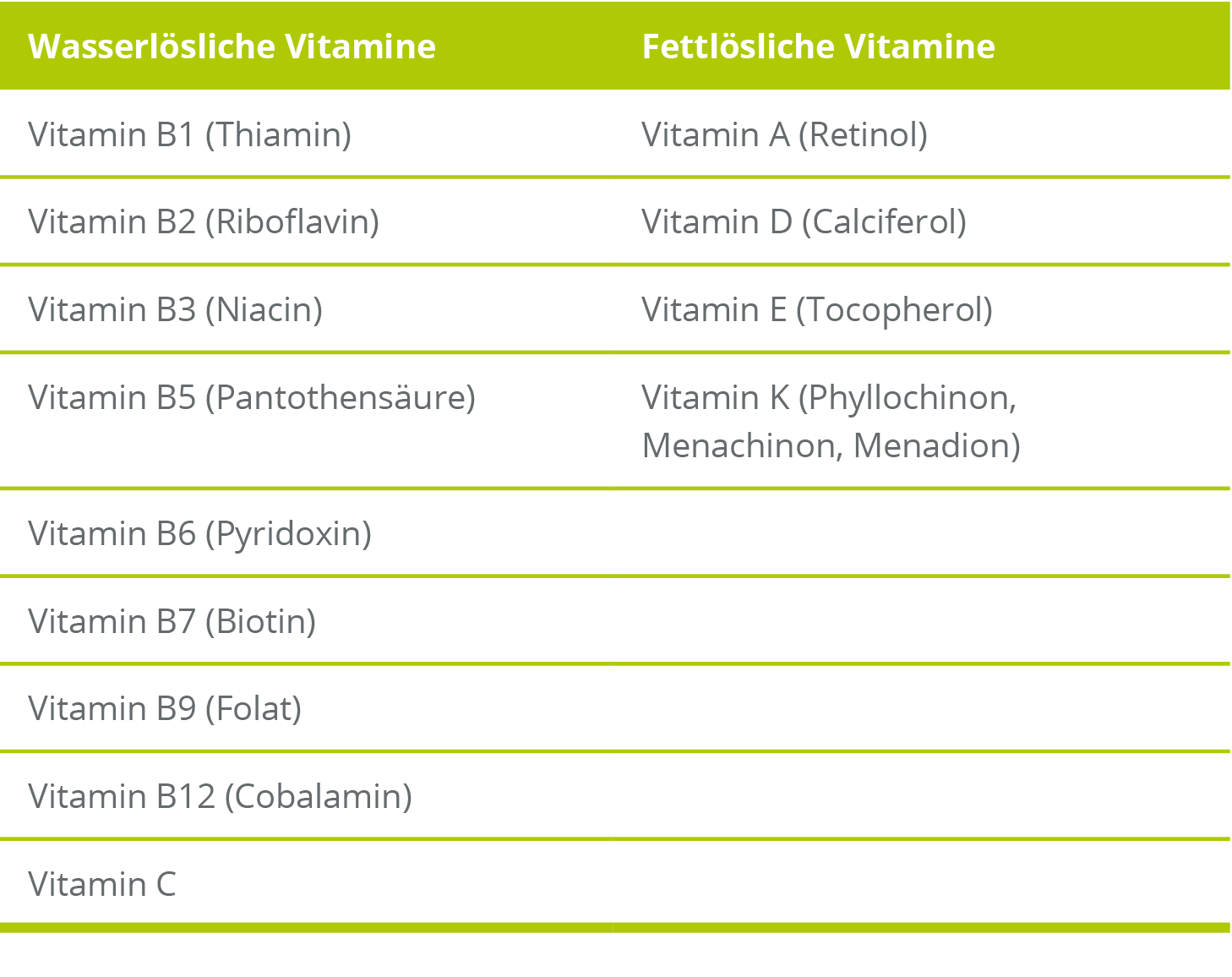 Vitamine sind organische Substanzen, die für sehr viele Stoffwechselprozesse im Körper benötigt werden, wie z. B. für die Zellteilung, die Energiegewinnung oder das Immunsystem. Mit der Ausnahme von Vitamin D können Vitamine vom Körper nicht selbst produziert werden. Vitamine werden anhand ihrer Löslichkeit in wasserlösliche und fettlösliche Vitamine unterteilt.